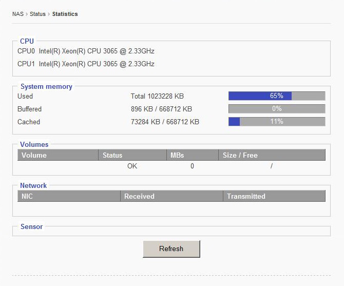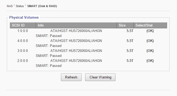 This page monitors each SCSI ID (hard drives) connection. The system will check the SMART status of each hard drives connection periodically. A properly functioning system will display “Passed.” If an error is present, a warning will be shown in its place. Clicking “Refresh” prompts the system to reveal real-time data. Warnings can also be cleared by clicking “Clear Warning”