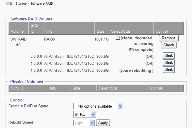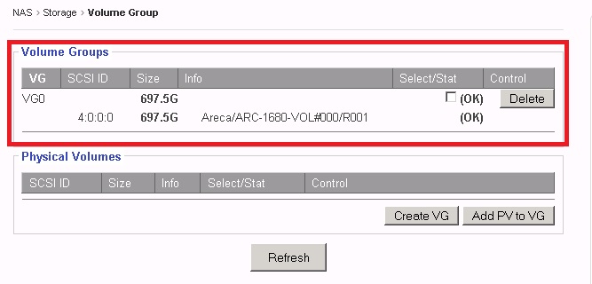 After the Internal RAID volume/External RAID volume/iSCSI Target volume has been created and the NAS restarted, the volume will show up in the “Physical Volumes” window.