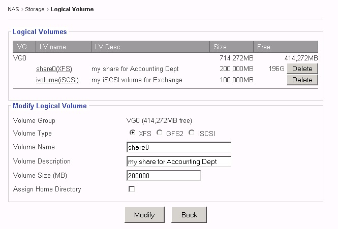 When clicking on an existing LV name, the “Modify Logical Volume” window will display the corresponding LV info.