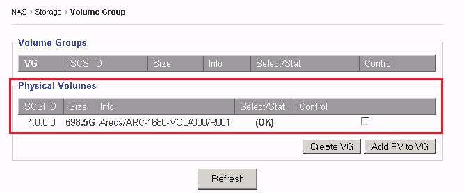 After the Internal RAID volume/External RAID volume/iSCSI Target volume has been created and the NAS restarted, the volume will show up in the “Physical Volumes” window.
